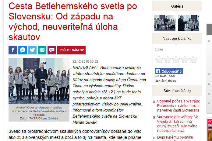 Betlehemské svetlo sa vďaka skautským posádkam dostane od Kútov na západe krajiny až po Čiernu nad Tisou na východe republiky. Počas soboty a nedele (23.12.) sa bude tento symbol pokoja a dobra šíriť prostredníctvom vlakov po celej krajine. Informoval o tom koordinátor Betlehemského svetla na Slovensku Marián Suvák.