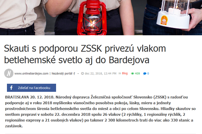 Národný dopravca Železničná spoločnosť Slovensko (ZSSK) s radosťou podporuje aj v roku 2018 myšlienku vianočného posolstva pokoja, lásky, mieru a jednoty prostredníctvom šírenia betlehemského svetla do miest a obcí po celom Slovensku.