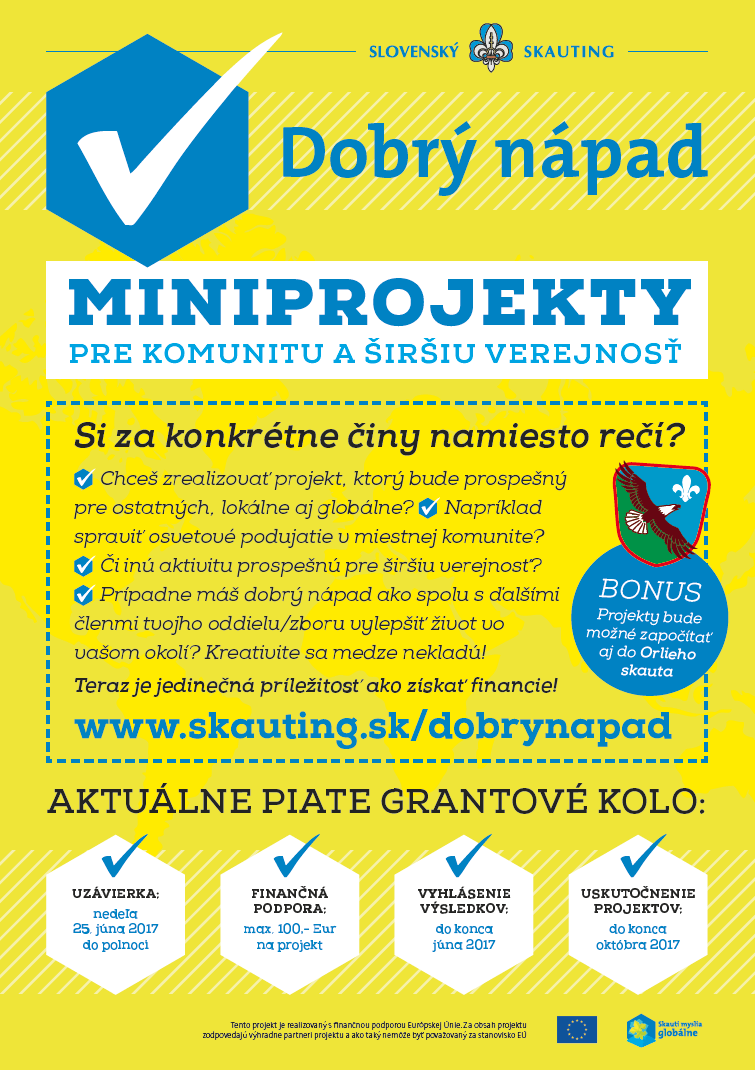Grantový program Dobrý nápad financovaný projektom Skauti myslia globálne otvára svoje brány novým miniprojektom už piaty, no zároveň posledný krát. Opäť je možnosť získať podporu na miniprojekt prospešný pre miestnu komunitu a širšiu verejnosť.