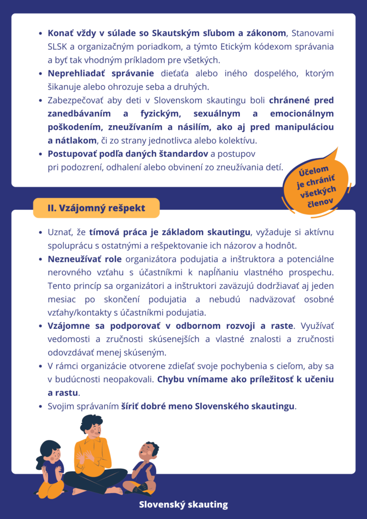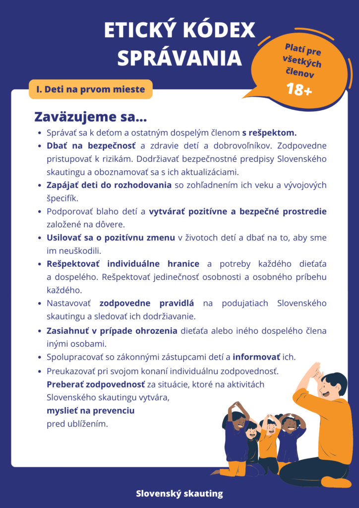 Z týchto dôvodov prinášame témy ochrany detí pred formami násilia a zneužívania aj do skautingu a vzdelávame radcov, vodcov a dospelých dobrovoľníkov. Základným dokumentom, z ktorého pritom vychádzame, je 22. kapitola Organizačného poriadku o Ochrane detí. V nej nachádzame aj Etický kódex, ktorý sa každý dospelý člen zaväzuje dodržiavať.
