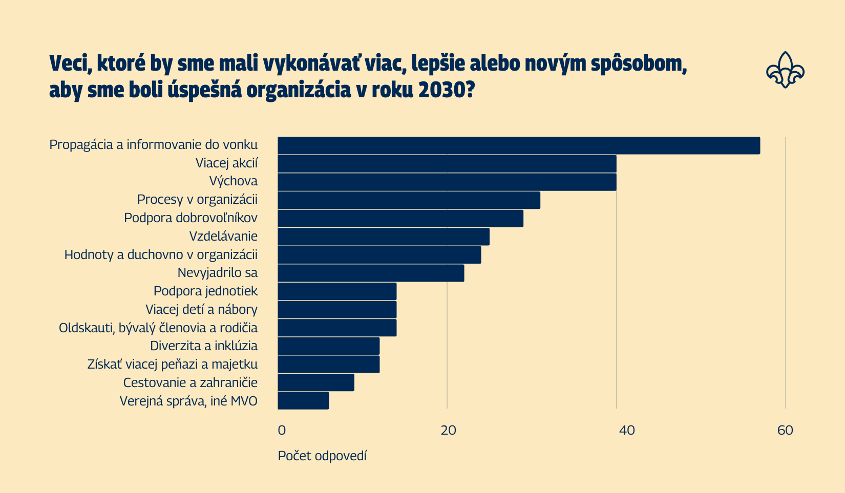 Keďže v otázke mohol respondent uviesť až 3 odpovede, celkovo sme získali 349 odpovedí, najčastejšie opakujúca sa odpoveď bola smerovaná k propagácii a informovania verejnosti o činnosti skautingu, táto odpoveď bola spomenutá 57-krát. Ďalšími najviac spomínanými odpoveďami je dopyt po skautských akciách a taktiež zameranie sa na výchovu mladých, každá z týchto odpovedí odznela 40-krát. Okolo 30 odpovedí sa venovalo potrebe venovať sa procesom v organizácii a podpore dobrovoľníkov. Ďalšie odpovede si môžete pozrieť v grafe zobrazenom nižšie.