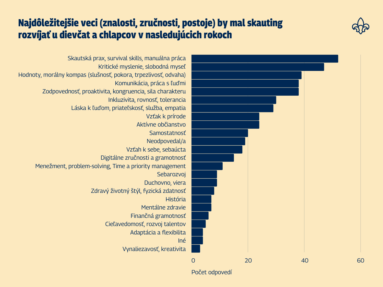V tomto článku by sme vám chceli priblížiť výsledky tohto prieskumu, na základe ktorých sme pripravovali aj Víziu skautingu do roku 2030 a taktiež vyčlenili priority, na ktoré by sa mal Slovenský skauting zamerať v najbližších rokoch.