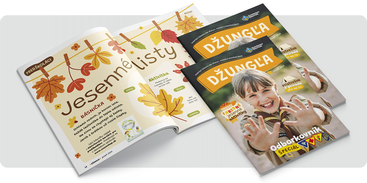 Pestrofarebné číslo jesenného vydania Džungle ťa prevedie prvou skautskou družinovkou. Dozvieš sa, čo to vlastne znamená družina, kto je to nováčik či radca, že na skaute máme skautské prezývky a nosíme na krku skautské šatky. V rubrike „Buď pripravený“ pridáme pár tipov, ako bezpečne zvládnuť cestu do klubovne aj samostatne. Na výpravách do prírody si môžeš vyskúšať stavbu jednoduchého prístreška z celty. Návod nájdeš v praktickej rubrike „Ako na to“. Predškoláci sa vedia dosýtosti vyblázniť pri aktivitách v jesennom lístí, prečítať maľovaný príbeh alebo vyfarbiť skautskú ľaliu. V odborkovníku je pre teba pripravený precízny výber troch odboriek – Rosnička, Olympionik a Prvá pomoc. Na skúmanie počasia nadviažeš aj v tvorivom článku. Podľa návodu si skús vyrobiť zrážkomer a smerovník. Čaká ťa ešte vyhodnotenie letnej fotosúťaže. Ak si sa zapojil, pozri, či nevyhrala práve tvoja fotografia!