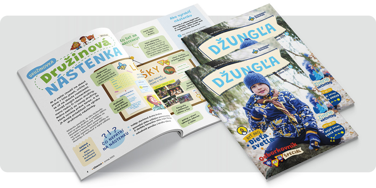 Prelistuj si nové číslo zasneženej Džungle a ponor sa do závejov skautských dobrodružstiev! Na skaute aj v družine si už isto ako doma, preto je čas na skvelý zlepšovák – vyrob si spolu s kamarátmi družinovú nástenku. Tipy ako na to prinášame hneď na úvod. Zaujímavé informácie o tom, kto je to „Dieťa svetla“ sa dozvieš v článku o Betlehemskom svetle a pridáme aj fúru praktických rád pre roznášanie Betlehemského svetla. Potešia ťa tradičné tipy na kreatívne aktivitky počas zimného obdobia a naučíš sa tiež nájsť sever podľa hviezd. Na predškolákov čaká bohatá nádielka snežných radovánok, maľovaný príbeh i zamotané rukavičky :). V „Odborkovníku“ pridáme starostlivo vybrané tipy na tri zaujímavé odborky a v tvorivej rubrike nájdeš návod, ako vyrobiť skautskú košeľu z papiera. A, samozrejme, nesmie chýbať aj chutný recept od legendárnej kuchárky Tiny.
