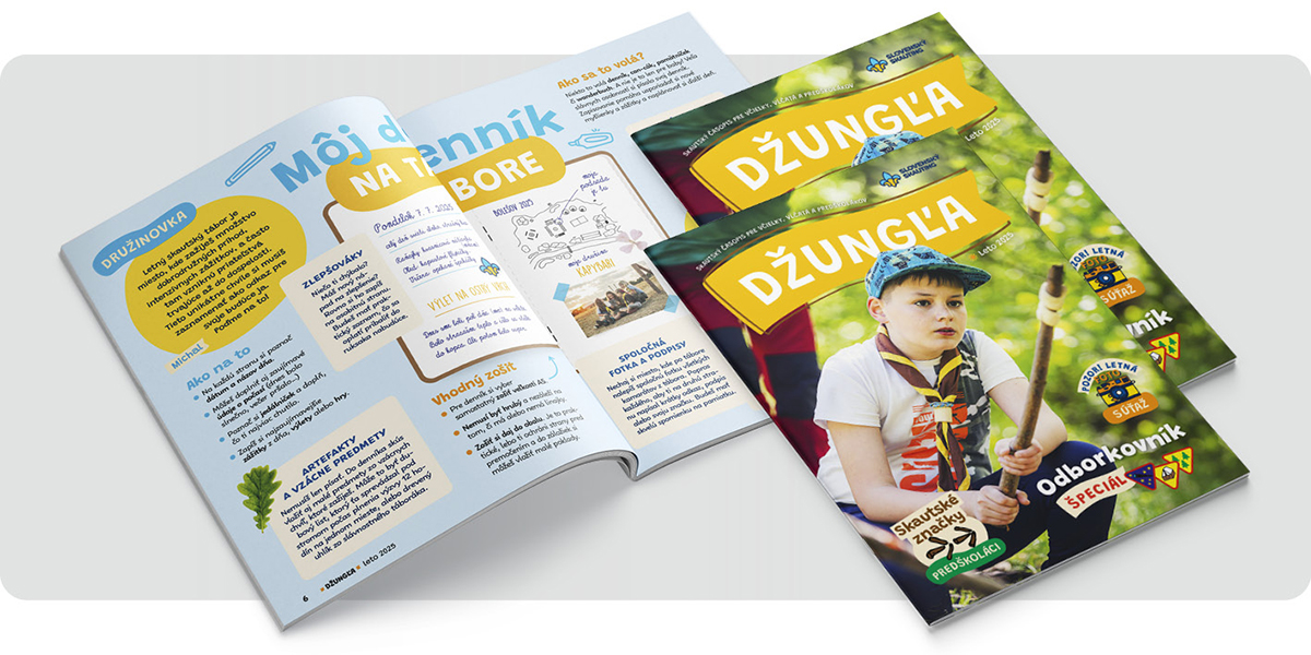 Letná Džungľa prináša kopcovitú porciu užitočných tipov, ktoré určite využijete aj na letnom skautskom tábore. Dozviete sa, čo sú to táborové rituály (vrátane praktického ťaháku pre skautskú hymnu a sľub), a poradíme, ako začať písať denník počas pobytu na tábore. Vysvetlíme si, ako postaviť skautskú podsadu a pridáme aj pár tipov na praktické vychytávky na zariadenie podsady. Nájdete tiež viacero tipov na zaujímavé letné aktivity – nechajte odpočinúť svoje oči a začítajte sa do nápadov v rubrike Aktivitky. Najmenší predškoláci si isto prídu na svoje – pri výrobe skautských značiek môžu použiť všetky prírodné drobnosti, ktoré nájdu na zemi. V rubrike buď pripravený vysvetlíme, ako sa zachovať v krízových situáciách a kedy je potrebné volať číslo 112. Veríme, že toto číslo počas leta nebudete musieť kontaktovať. Lahodnú bodku nájdete v podobe outdoorového receptu a inšpirovať vás budú tvorivé tipy na výzdobu v tábore.