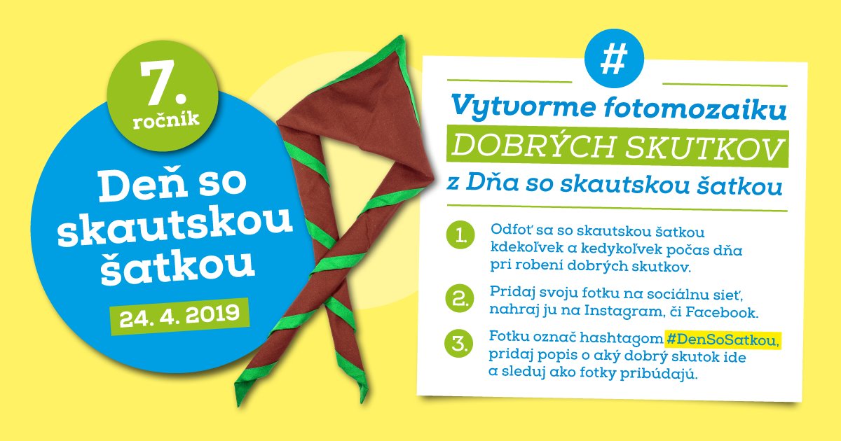 Význam a veľkosť dobrého skutku zvýrazňuje, že o ňom verejne nehoríme. Spravme to však 24. apríla trochu inak, naopak. Dajme svojmu okoliu nápad na dobrý skutok. Príležitostí je totiž okolo nás neúrekom, stačí sa len správne pozerať. Naša zverejnená inšpirácia môže podnietiť niekoho iného k ďalšiemu skutku osožnému pre niekoho iného, či svoje okolie. Dobré skutky tak budú v tento deň postupovať ďalej a ďalej… A pevne veríme, že neostanú len v skautskom kruhu, ale dostanú sa aj medzi vašich priateľov, známych, kolegov, či rodičov. A pokojne ich pozvite do udalosti, nech na to nezabudnú. Priebežne v nej budeme zverejňovať nápady na malé i väčšie skutky každodenného života. Alebo lepšie povedané: malé návody na krajší svet.