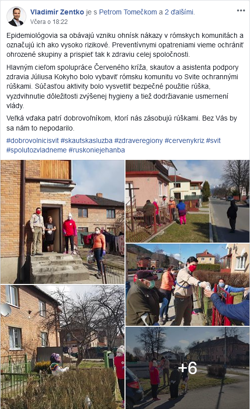Epidemiológovia sa obávajú šírenia nákazy v rómskych osadách. Aj tu je dôležité vysvetliť funkciu a potrebnosť ochranných rúšok. A ešte dôležitejšie je aj túto skupinu obyvateľstva rúškami opatriť a aspoň čiastočne tak prispieť k zníženiu rizika šírenia nákazy medzi nimi. Aj s týmto v Skautskej službe pomáhame.