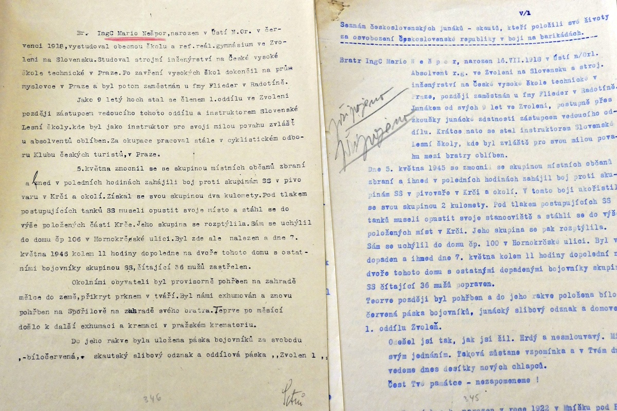 Za oslobodenie československého národa v druhej svetovej vojne bojoval aj Ing. Mario Nešpor. Narodil sa v roku 1918 v Ústí nad Orlicí. Od svojich deviatich rokov bol členom skautského oddielu vo Zvolene. Neskôr sa stal zástupcom vedúceho oddielu a tiež inštruktorom Slovenskej lesnej školy. 7. mája 1945 bol príslušníkmi SS zajatý a popravený.