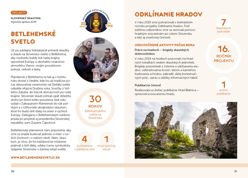 Vo výročnej správe za rok 2019 sa dočítate i o ďalších zaujímavých a úspešných projektoch, akými bolo spustenie novej oficiálnej webovej stránky Slovenského skautingu, tradičný Deň so skautskou šatkou, Rómsky skauting, Medzinárodná cena vojvodu z Edinburghu, My Europe My Say či Odklínanie hradov.