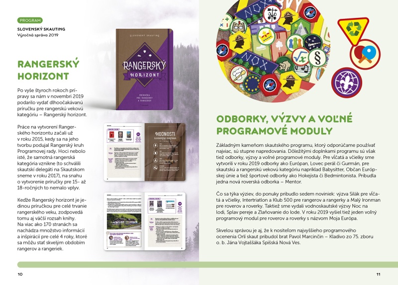 Programovej rade Slovenského skautingu sa podarilo priniesť dlhoočakávanú príručku pre členov vo veku 15 – 18 rokov (rangerky a rangerov) Rangerský horizont. Okrem publikačnej činnosti členovia Programovej rady nezaháľali ani pri napĺňaní programovej ponuky. Vďaka tomu nám pribudlo niekoľko nových odboriek, výziev i jeden nový voľný programový modul. Medzi tradičné akcie programovej rady opäť patrili Družina roka a Radcovské fórum. 11. ročník obľúbenej súťaže Družina opäť preveril zručnosti a vedomosti zapojených družín. Titul Družina roka 2019 si napokon vybojovali Sovičky zo 45. zboru Posledného spojenectva z Veľkého Zálužia. Radcovské fórum opäť spojilo radkyne a radcov z celého Slovenska.