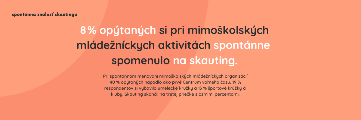 Znalosť o nejakej značke sa najčastejšie meria dvoma spôsobmi, ktoré sa navzájom dopĺňajú. Prvý z nich je tzv. spontánna znalosť. Pri zisťovaní spontánnej znalosti respondentovi sa povie, že má uvažovať o značkách v určitom segmente, v našom prípade o organizáciách, ktoré ponúkajú deťom a mladým mimoškolské aktivity. Úlohou opýtaných je bez nápovied vymenovať, aké značky im z danej kategórie napadnú ako prvé, “top of the mind”. Takéto značky sú potom považované za akéhosi primárneho reprezentanta značky v danom segmente. V prípade nášho prieskumu si pod mimoškolskými mládežníckymi organizáciami vybavilo až 40% opýtaných centrá voľného času, 19% opýtaných napadli rôzne umelecké krúžky a 13% športové krúžky a kluby. Na skauting si spomedzi 1005 opýtaných spomenulo 80 ľudí (8%). Keďže na členoch našej organizácie vidíme, ako ich skauting formuje a pomáha nielen im, ale aj komunite, v ktorej žijú, je len škoda, že si na skauting spomenulo len 8% ľudí. Skauting momentálne nie je v pozícii, kedy by zastával spontánne popredné miesto v mysliach rodičov pri výbere mimoškolských aktivít pre ich dieťa, či dospelých pri výbere ich dobrovoľníckych aktivít. Avšak je potrebné podotknúť, že vysoké percento respondentov, až 32%, si nevedelo vôbec vybaviť žiadnu organizáciu, ktorá sa organizovane a mimo školského prostredia venuje rozvoju detí a mládeži. Vidíme, že verejnosť nemá konkrétnejší prehľad o takýchto organizáciách na Slovensku, a že pod mimoškolskými aktivitami si najčastejšie vedia vybaviť rôzne typy krúžkov podľa ich zamerania.