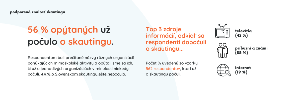 Z 562 respondentov, ktorí o skautingu už počuli, sa o ňom dozvedeli primárne z televízie, 35% od príbuzných a známych, 19% z internetu a 13% z tlačovín. Približne rovnaké percento opýtaných (10 – 12%) sa o skautingu dozvedelo priamo cez ich známych, ktorí sú skauti, cez sociálne siete, od spolužiakov v škole či kolegov v práci. Vidíme, že televízia je skutočne silné médium so širokým zásahom slovenskej verejnosti, čo by bolo v budúcnosti možné viac využiť pri šírení povedomia o skautingu a činnosti Slovenského skautingu na Slovensku.