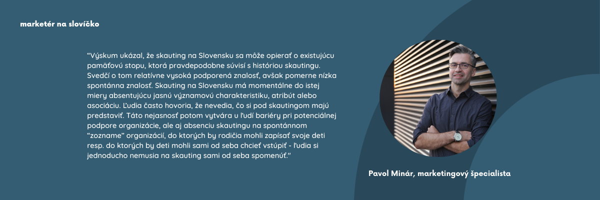 “Výskum ukázal, že skauting na Slovensku sa môže opierať o existujúcu pamäťovú stopu, ktorá pravdepodobne súvisí s históriou skautingu. Svedčí o tom relatívne vysoká podporená znalosť, avšak pomerne nízka spontánna znalosť. Skauting na Slovensku má momentálne do istej miery absentujúcu jasnú významovú charakteristiku, atribút alebo asociáciu. Ľudia často hovoria, že nevedia, čo si pod skautingom majú predstaviť. Táto nejasnosť potom vytvára u ľudí bariéry pri potenciálnej podpore organizácie, ale aj absenciu skautingu na spontánnom “zozname” organizácií, do ktorých by rodičia mohli zapísať svoje deti resp. do ktorých by deti mohli sami od seba chcieť vstúpiť – ľudia si jednoducho nemusia na skauting sami od seba spomenúť.