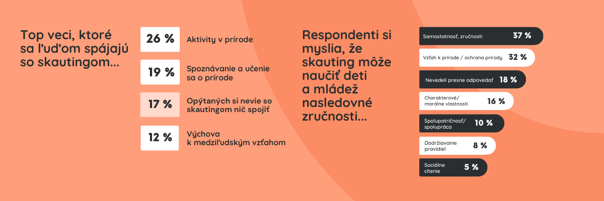 Keď ste niekomu spomenuli, že ste skaut/ka, iste ste sa stretli s rôznorodými názormi. Teraz sme si na vzorke 1005 ľudí overili, čo sa obvykle spája so slovom skauting. Spontánne si 26% opýtaných v spojitosti so skautingom predstavilo aktivity v prírode a 19% spoznávanie a učenie sa o prírode. 17% spomedzi 1005 opýtaných si so skautingom nevedelo spojiť vôbec nič, resp. nepočulo nič konkrétne, čo si má pod týmto pojmom vybaviť. 12% respondentov si pod skautingom predstavuje výchovu k medziľudským vzťahom a 11% organizáciu, ktorá robí aktivity pre mládež. 9% respondentov si skauting spája s ochranou prírody, 8% s tábormi a stanovaním, 5% s turistikou a 4% s náboženskými hodnotami. Možno by ste predpokladali, že pod skautingom si väčšina predstaví lovcov bobríkov, pionierov, tradičnú či historickú organizáciu. Tieto pojmy si však so skautingom spojilo spolu len asi 90 respondentov, čiže by sme mohli upustiť od týchto všeobecných stereotypov, nakoľko nie sú v skutočnosti v spoločnosti v takej miere, ako si my v našich radoch možno myslíme. Prekvapivá je aj skutočnosť že iba okolo 30 opýtaných si so skautingom spája dobrovoľníctvo.