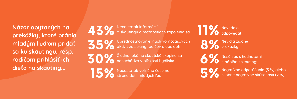 Sme radi, že až 93% opýtaných nemá výhrady voči skautingu ako takému, no ďalšou otázkou sme ešte chceli ísť ešte viac do hĺbky a zistiť, či si myslia, že existujú nejaké bariéry, ktoré by mohli brániť mladým ľuďom pridať sa ku skautingu, resp. rodičom prihlásiť ich dieťa na skauting. Z deviatich ponúknutých odpovedí až 43% označilo, že za najväčšiu prekážku považuje nedostatok informácií o skautingu a možnostiach zapojeniach sa. 35% uprednostňuje iné voľnočasové aktivity a pre 30% je náročné sa zapojiť do skautingu, nakoľko v okolí ich bydliska sa nenachádza žiadna lokálna skautská skupina. Za jednu z bariér považujú respondenti taktiež nedostatok voľného času detí a mládeže (15%). 77 respondentov (8%) nevidí žiadne prekážky. 6% opýtaných nesúhlasí s hodnotami a náplňou skautingu, čo im prirodzene bráni v zapojení sa do skautskej činnosti. Spolu len 5% opýtaných má buď zlé odporúčania od známych (3%) alebo sa osobne stretlo s negatívnymi príkladmi skautov v našich radoch (2%).