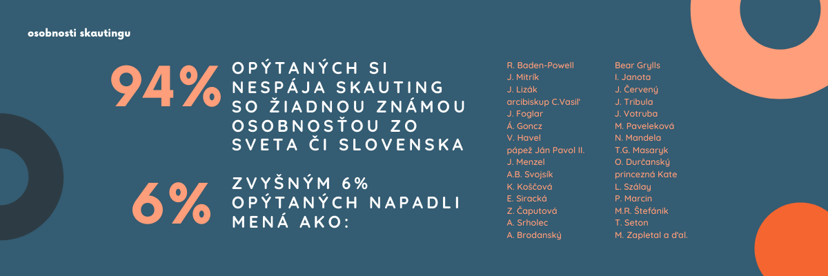 V rámci prieskumu sme tiež zistili, že väčšine opýtaných (94%) nenapadú žiadne známe slovenské či zahraničné osobnosti, ktoré boli v minulosti skautmi/skautkami. Zo zaujímavosti spomenieme, že šiesti respondenti si spomenuli na Baden-Powella, no medzi osobnosťami, ktoré si ľudia spájajú so skautingom, padli aj nám známe skautské mená ako J. Mitrík, súčasný Náčelník (5 respondenti), J. Lizák, riaditeľ ústredia (4 respondenti) či A. Brodanský (1 respondent), skautský brat a záchranár z Kežmarku.