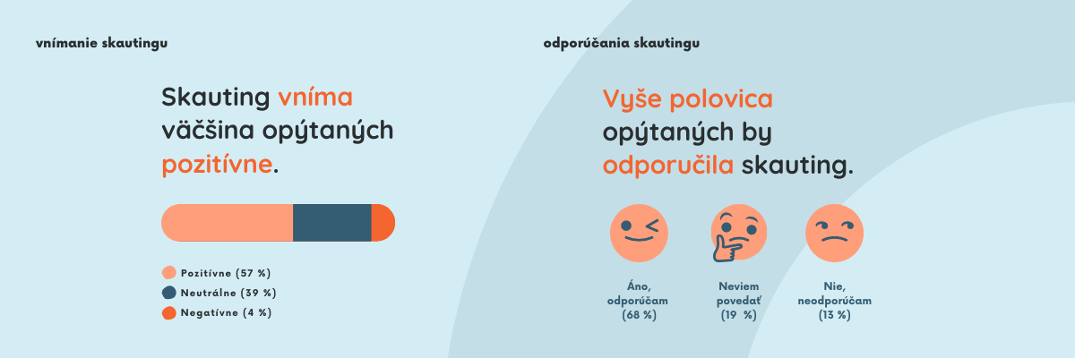 Vo všeobecnosti skauting vníma 57% respondentov pozitívne, 39% neutrálne a len 4% negatívne. Vysoké percento pozitívneho vnímania nás veľmi teší. No fakt, že takmer 40% nemá jasno v tom, ako sa voči skautingu vôbec postaviť, je niečo, čo našou komunikačnou stratégiou chceme zmeniť a prikloniť tak misku váh k jeho pozitívnemu vnímaniu a podpore.