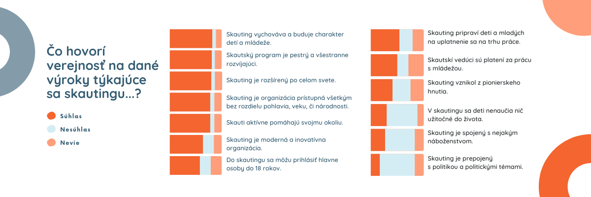 V rámci jednej z našich otázok sme respondentom ponúkli 13 výrokov o skautingu. Chceli sme zistiť, nakoľko s nimi opýtaní súhlasia/nesúhlasia. Prinášame vám najzaujímavejšie výsledky. V prevažnej miere mali opýtaní základné vedomosti o skautingu a súhlasili s výrokmi ako napríklad: “skauting vychováva a buduje charakter ľudí, skautský program je pestrý a všestranne rozvíjajúci, skauting je rozšírený po celom svete” a že sme organizácia, ktorá je prístupná všetkým bez rozdielu pohlavia, veku či národnosti. Väčšina opýtaných tiež správne identifikovala niekoľko výrokov ako nesprávne, čiže skauting si nespájajú s politickými stranami a témami alebo konkrétnym náboženstvom.