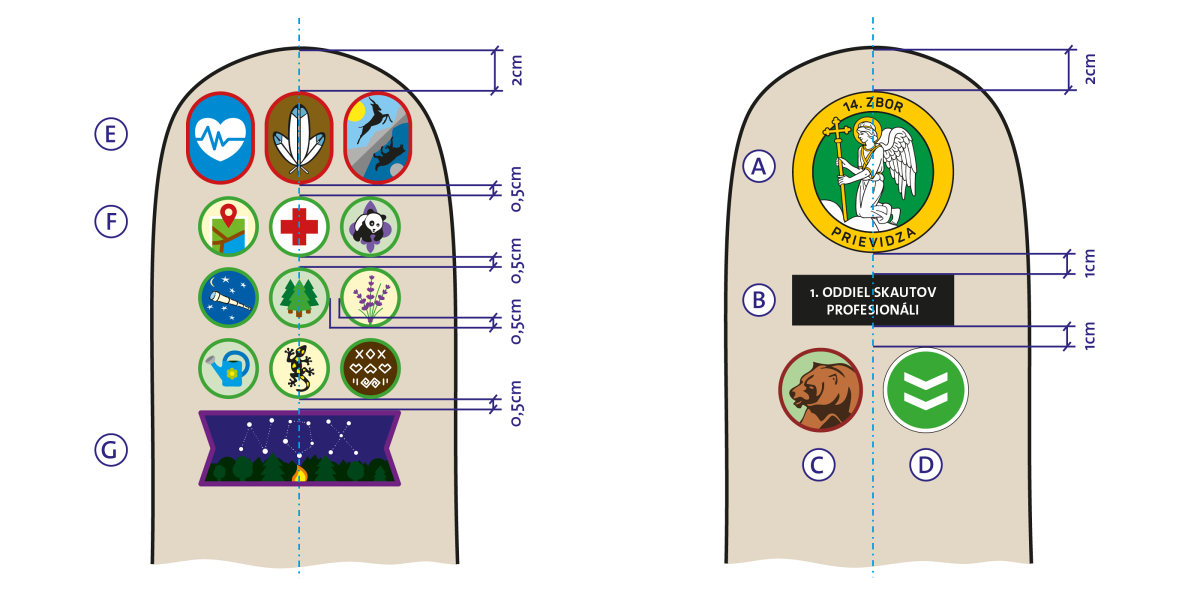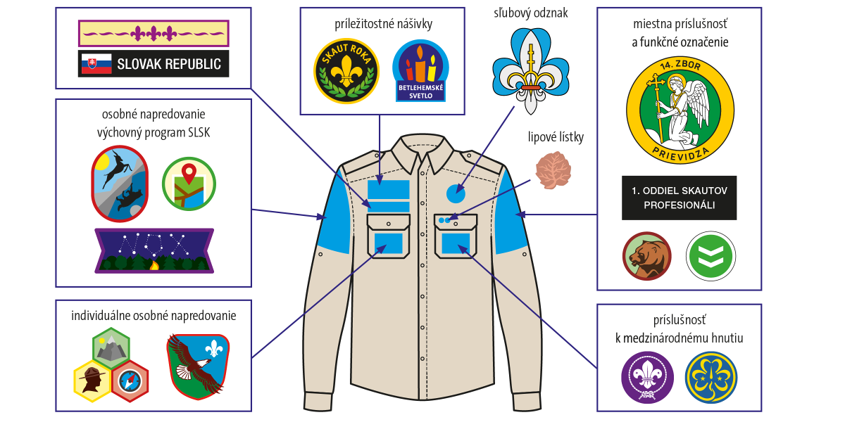 Ukážka z Kapitoly 15 Organizačného poriadku Slovenského skautingu: Nosenie odznakov, nášiviek a označení na skautskej košeli