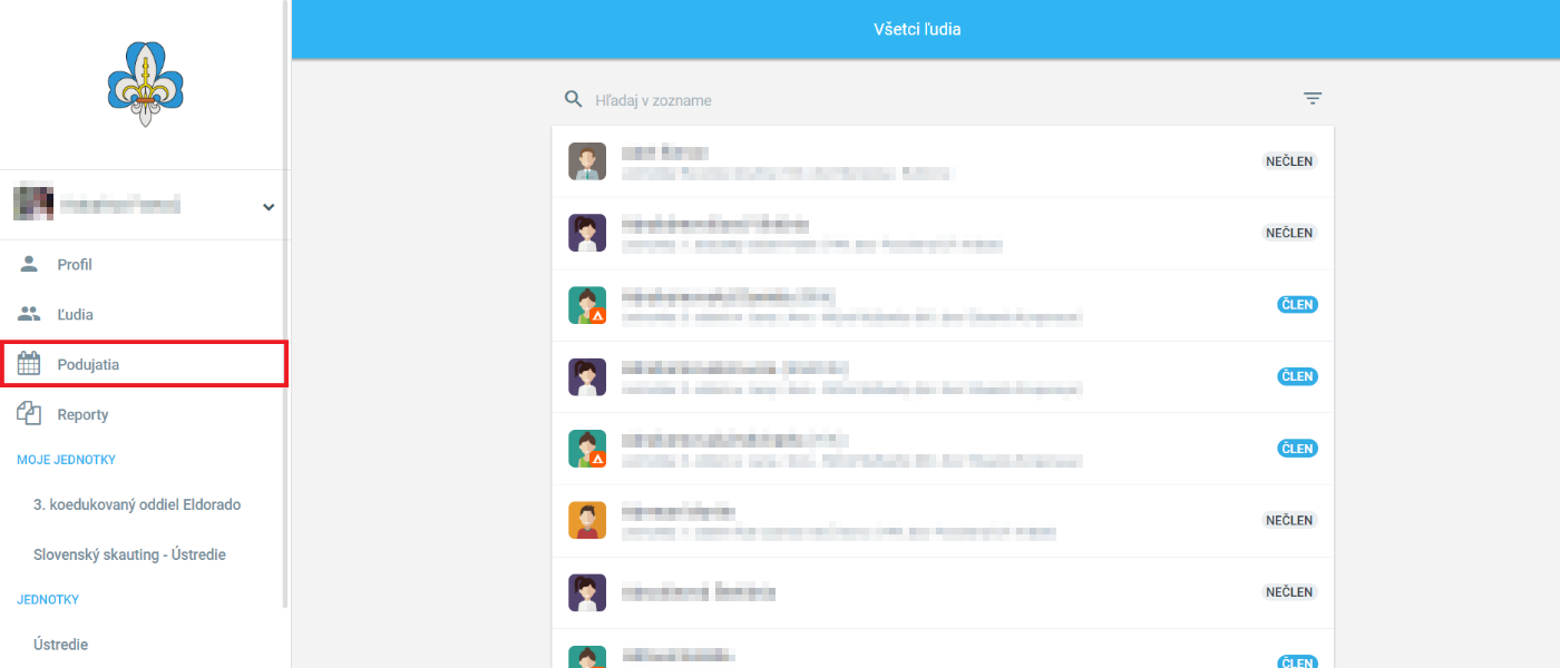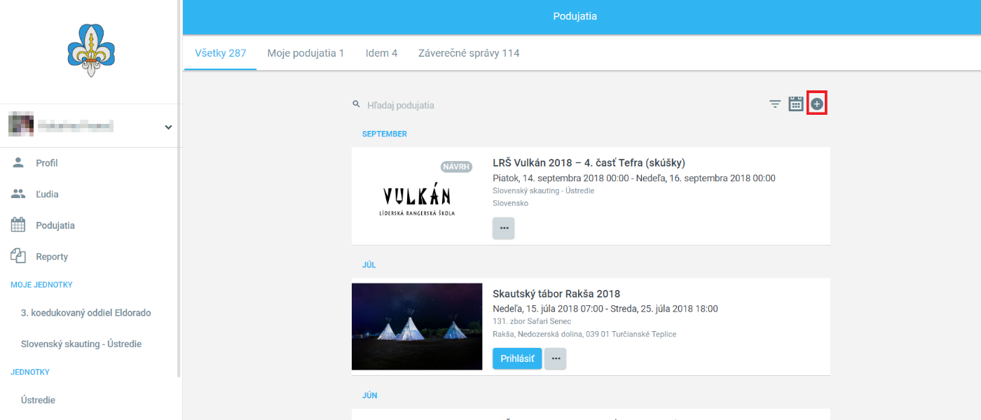 1. Po prihlásení do Tee-Pee si vľavo v menu klikneme na Podujatia.
