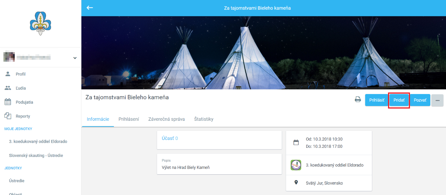 4. V ďalšom kroku ideme pridať účastníkov podujatia. Klikneme na Pridať.